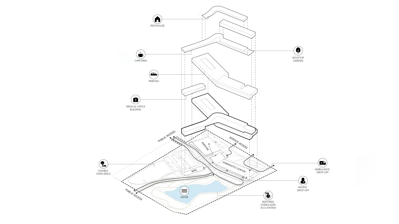 设计将杰克逊医疗系统多拉尔院区呈现为一个市民和社区聚集的场所,带动了下一代医疗设施的进步。多拉尔(Doral)院区将被视为一个健康、治愈、团结的设施进行运作,目的在于改变人们看待医院的传统眼光。这些建筑的设计旨在促进初级保健医生和专家之间的合作,并将灵活性和未来扩展纳入设计考量的范畴以应对不断变化的技术、人员配备和患者需求,并将成为杰克逊医疗系统的典范。