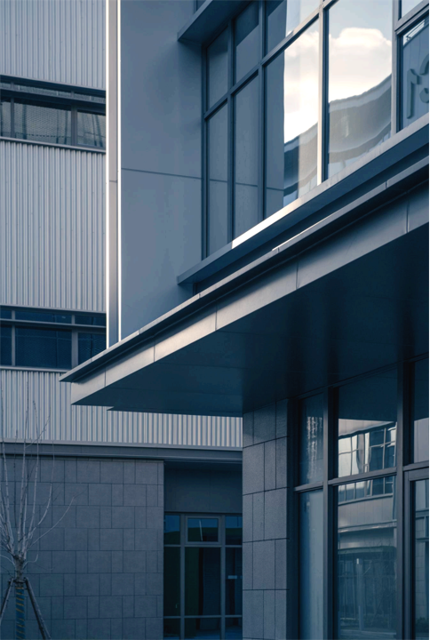 精细甄选与协调搭配多元材质,进一步强化立面的层次感与材质表现力——选用波纹及平面金属板、铝板、幕墙玻璃及生态石英砖等,以标准化设计达成造型的统一规整与质感提升。