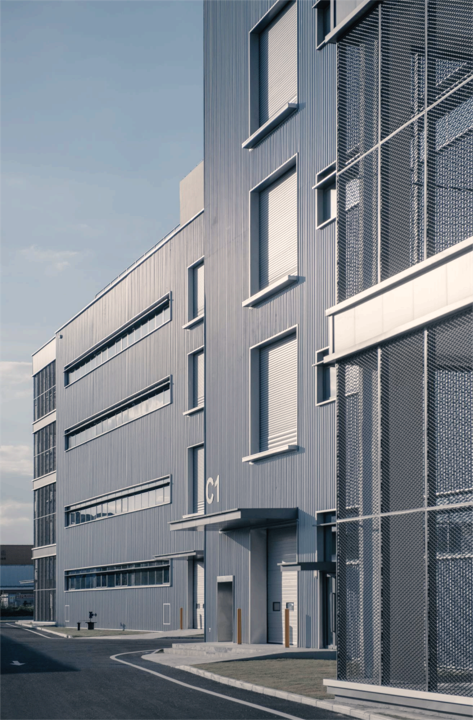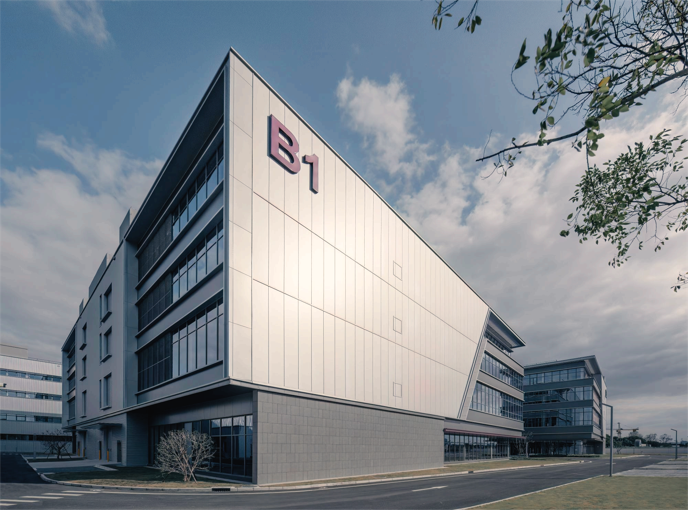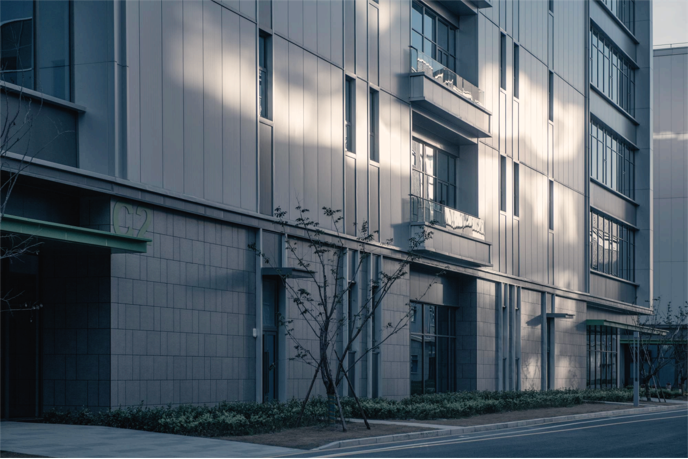 银灰色铝板与灰蓝色玻璃构成折线形立面,兼具未来感与韵律之美。设计不仅实现美学突破,更通过差异化体块组合,契合“工业上楼”所需的垂直产业布局。