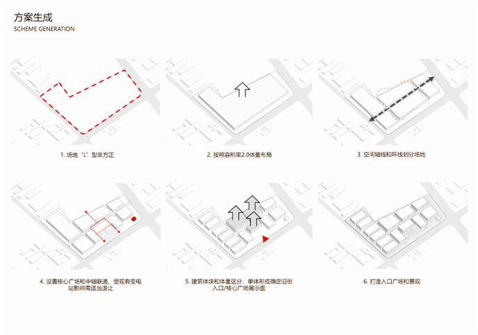 立面设计强调与环境和谐,分三级管控:主街侧为一级展示面,形态自由、标识性强;另两侧为二级展示面,规整统一、均衡协调;内部界面灵活通透,结合绿化营造宜人环境。