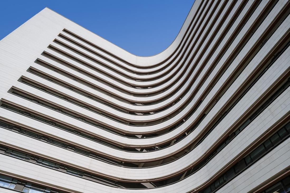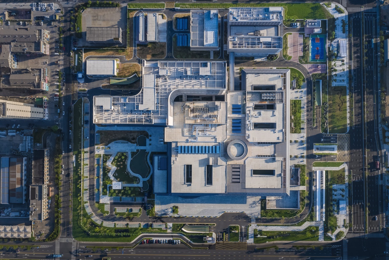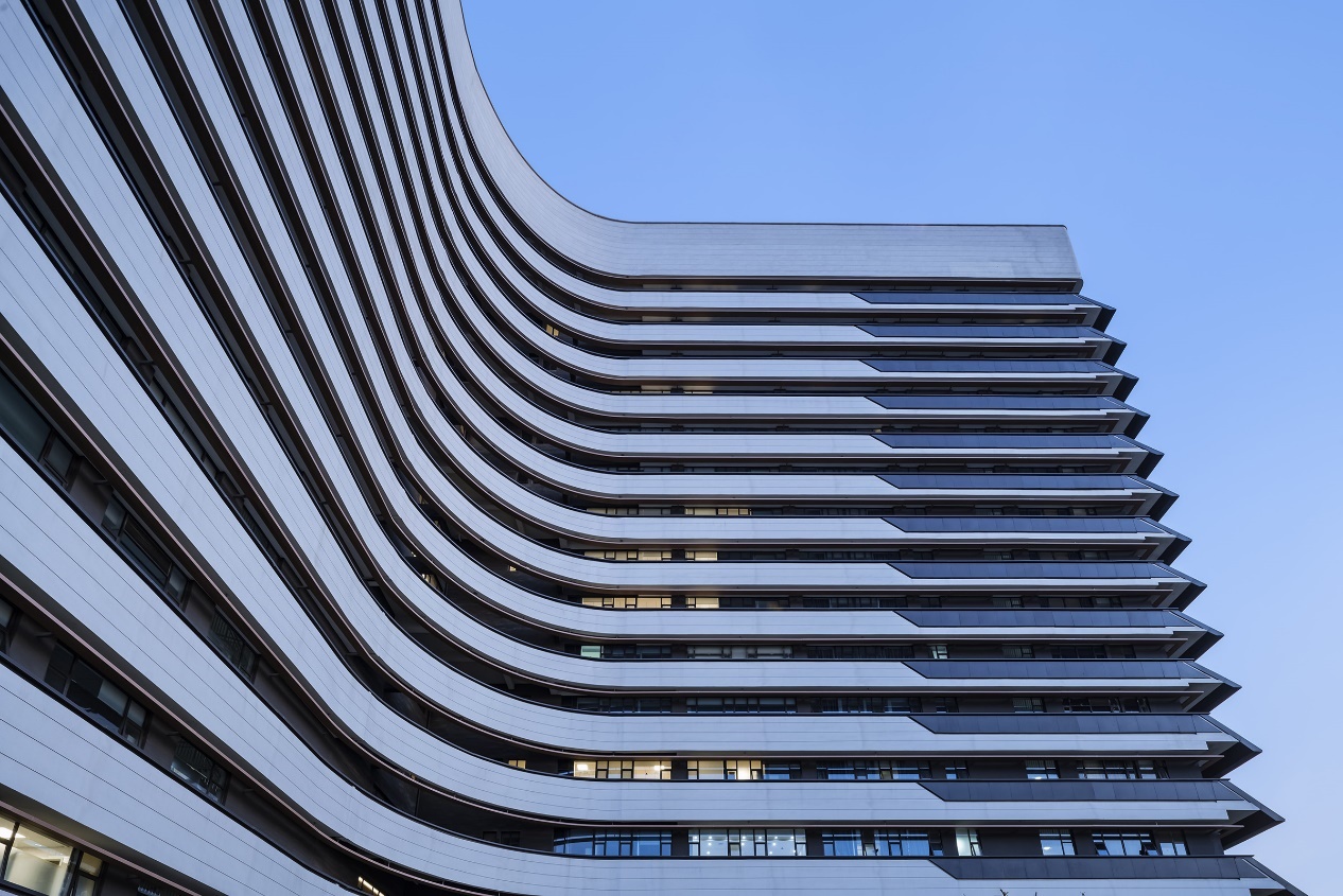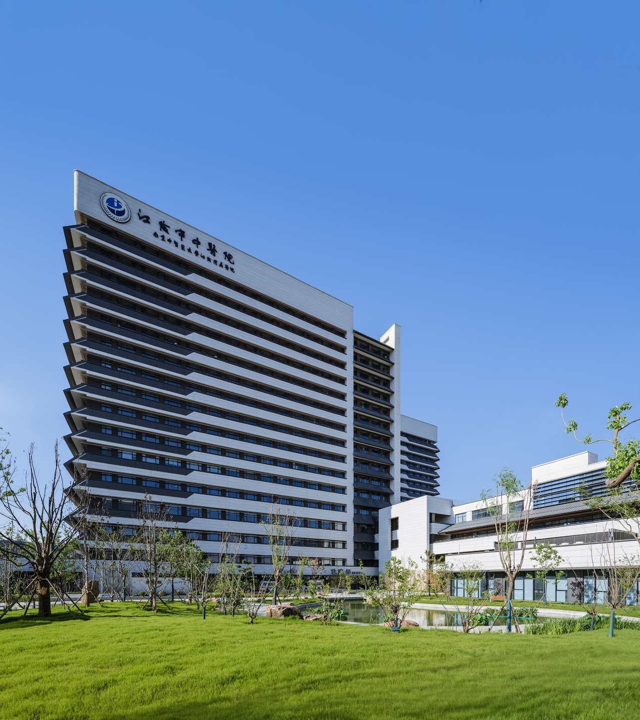 江阴新中医院虽坐落于新兴城区,但仍能捕捉到江南小城独有的尺度韵味。面对大规模医疗建筑常见的双病区长条形主楼设计,本设计巧妙地采用了两个病区错位布置,并以流畅的弧线相连。这一变化不仅成功应对了城市尺度的挑战,还塑造出一个既连续又统一的建筑形象。更重要的是,这样的布局提升了两个病区公共区域的导向性,同时也优化了空间品质,为患者提供了更加舒适的就医环境。
