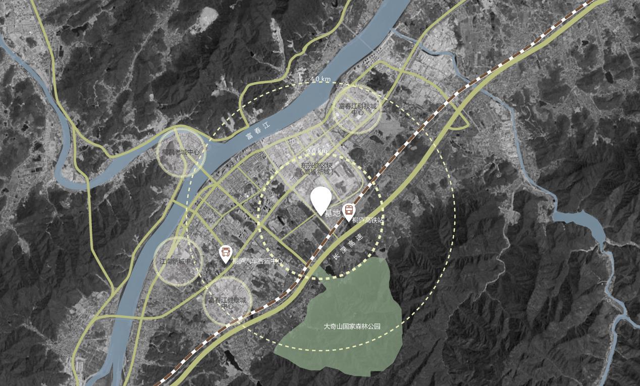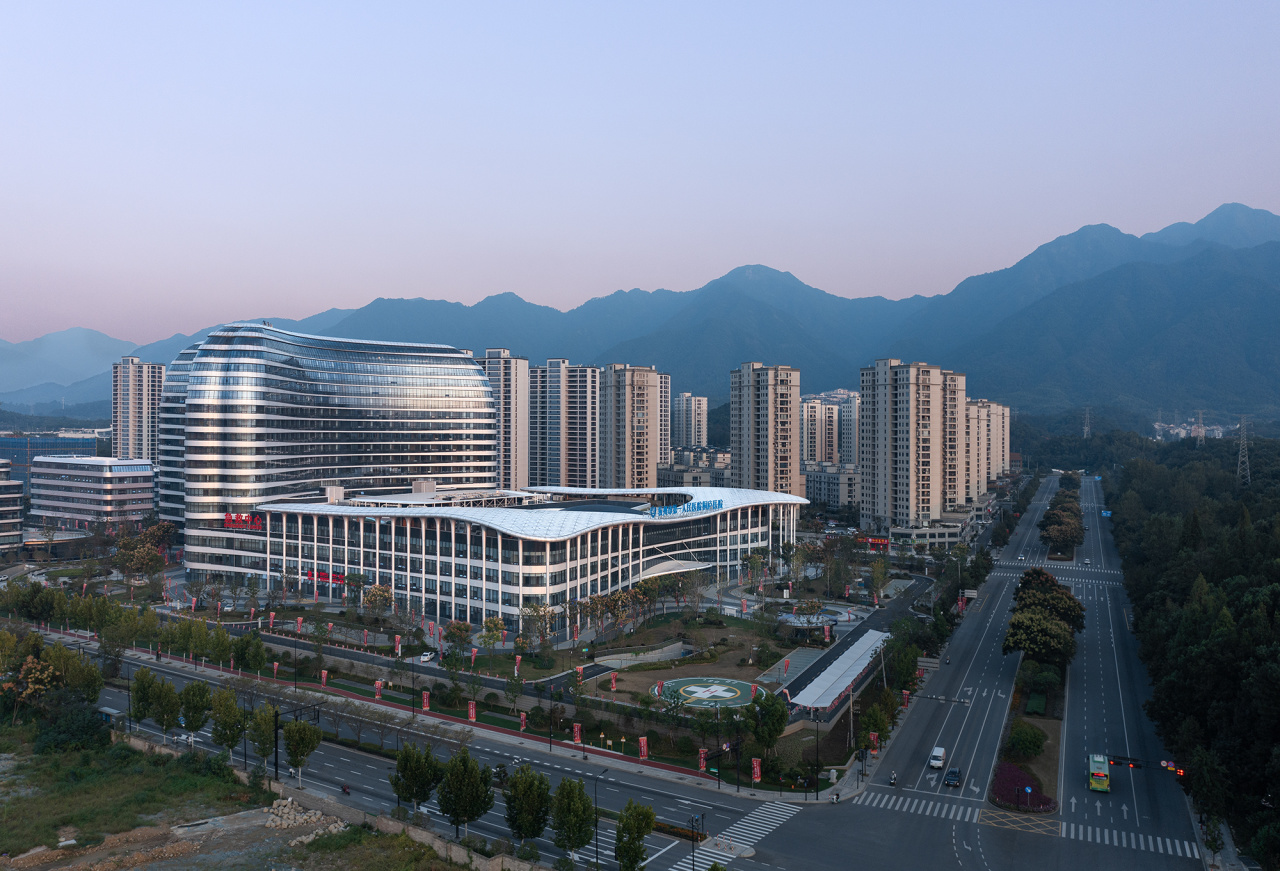 桐庐医院的迁建,始于2019年全球新冠疫情之前。为缓解省级三甲医院的诊疗压力,同时提升县级医院的医疗服务水平,桐庐将人民医院新院区选址于高铁未来城,基地周边道路平整,不远处群山环绕,以极具盛名的桐庐“富春山居图”的山水气质为背景。
