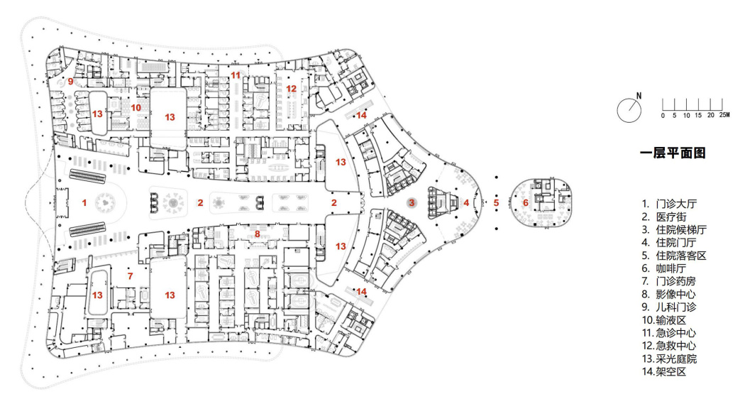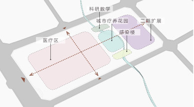 医疗建筑的设计,一方面需以功能性为主导,以诊疗的高效性为前提;另一方面医院建筑回归到为使用者服务,不再是冰冷的“治疗机器”,而是为患者、家属、医护、后勤等创造的服务性空间。为兼顾原有医院医护的使用习惯,并适应未来发展,设计采用了贯通式医疗街,串联门诊、医技、住院三大功能模块,形成统一的医疗综合体。