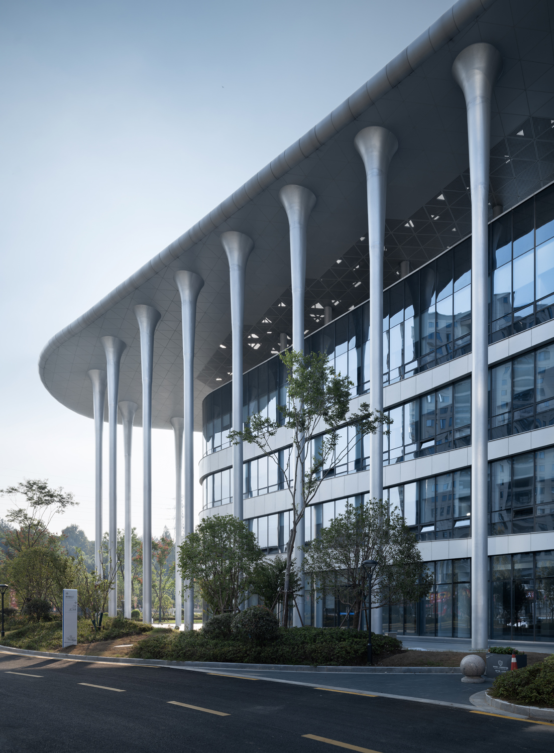 本项目采用更绿色环保的全钢结构形式,有效提升了疫情中的建造速度。并利用钢结构的特点,设置了大跨度、无遮挡的室内公共空间和降低建筑能耗的遮阳飘顶及柱廊,以灰空间过渡室内与室外,也为医院带来了古典的美与人性的暖。