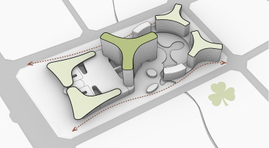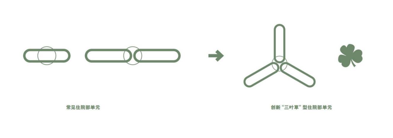 设计从在地性出发,由于基地非正南北朝向,呈现35度的偏角,设计首次创新地使用“三叶草型”的护理单元:将三个护理单元同层设置,中间空间打破常规设置共享的电梯厅,不仅可以同时为三个护理单元提供足够的日照与通风,而且整合了不同人群的使用电梯,提高了整体交通核的使用效率,有效控制了投资。