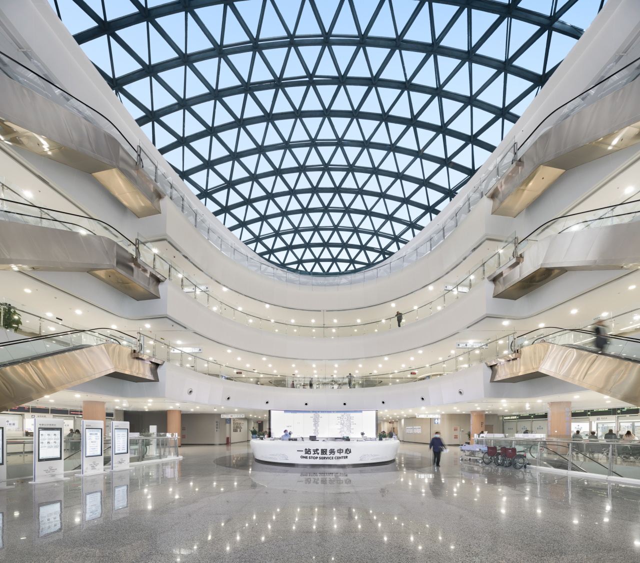 总图布局采用了“一字型”的医疗街,以商业综合体的空间设计手法来营造轻松氛围。在视觉上,以通高明亮的门诊大厅为起点,宽敞、无柱遮挡的医疗主街连通各门诊模块和医技功能,到达多部电梯环绕的住院电梯厅,并连通住院门厅。在实际使用过程中,就诊患者在室内宽敞的医疗街内即可看到门诊与各医技功能的划分与方位,可清晰地辨明方向,便捷地到达。