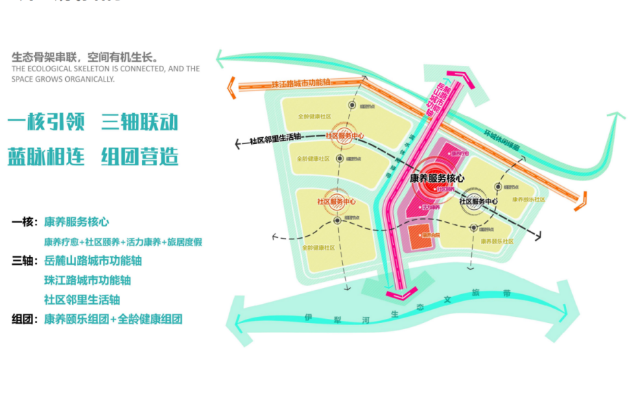 新疆可克达拉天鹅湖康养综合体项目,紧急急救以3千米范围内大型三甲医院为依托、内置社区医疗与健康管理中心,打造以医疗康复为引领、机构养老为支撑、社区养老为依托、居家养老为基础、旅居养老为特色的康养综合体。
