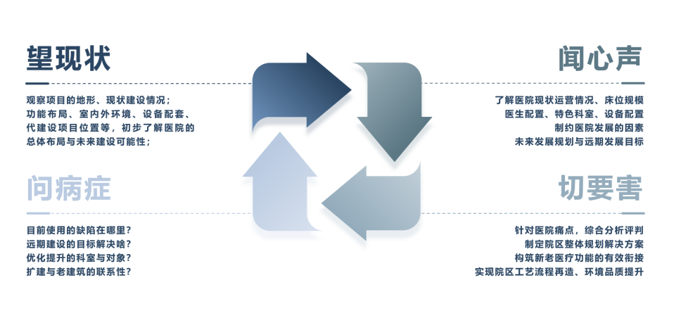 总的来说,设计的最高准则并非创造一座全新的建筑,而是通过精确的“针灸”,让老院区在保留历史底蕴的同时,生长出更高效、更安全、更人性化的现代医疗功能。针对老院区更新扩容项目,我们正在研究望闻问切——医院更新扩容与品质提升课题,依托望闻问切四步法,实现医院的精准化定位与解决策略。