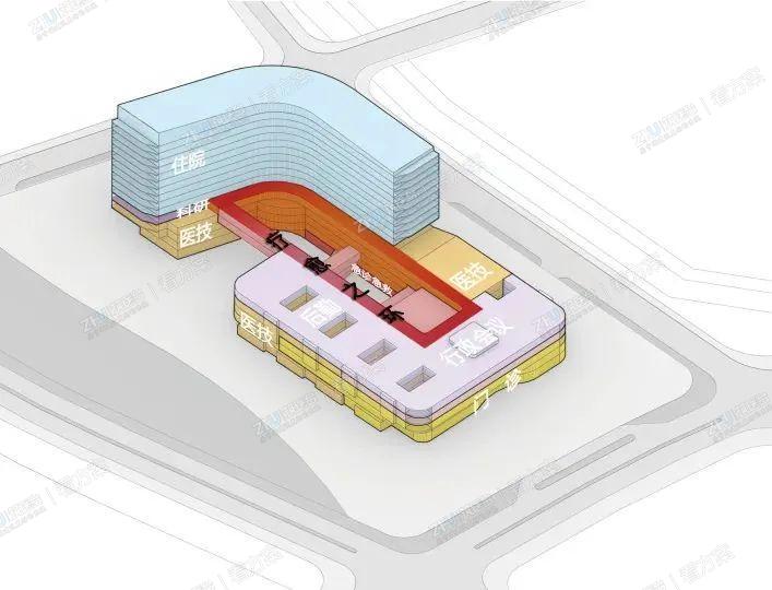 建筑设计围绕中央疗愈之环展开,通过环形医疗街串联组织各功能空间,门诊、医技、住院功能模块集中紧凑。疗愈之环串联各垂直交通,实现上环之后从地下停车到各层就诊的便捷寻路系统。