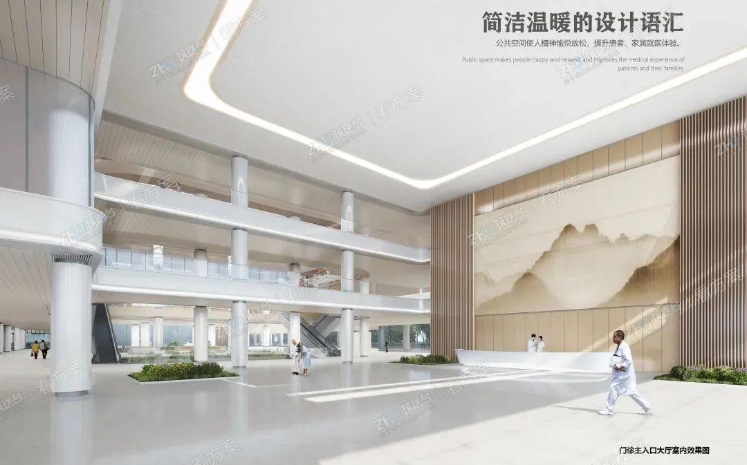 本方案采用高低错落的布局,形成观山望江的形态,立面运用江水元素,体现简洁柔美的现代化医院建筑风格。