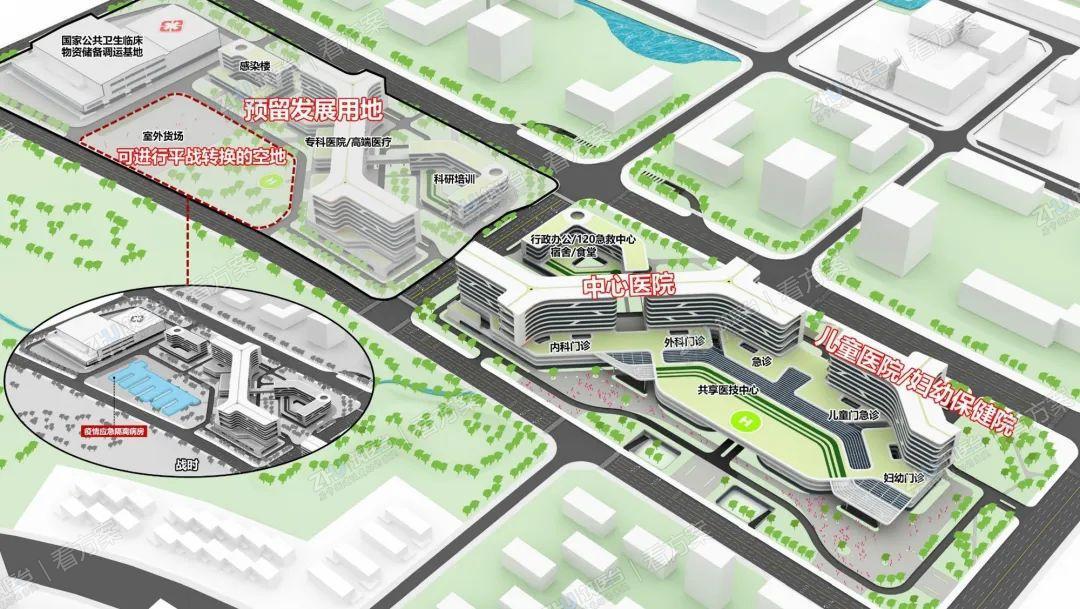 通过集约布局,在毗邻应急救援中心的附近腾出大块集中绿化,布置直升机停机坪,辅以市政管线接口打造“医疗白地”,最大程度满足平疫转换和公共卫生紧急事件、群死群伤突发事件的急诊急救与危重症治疗。